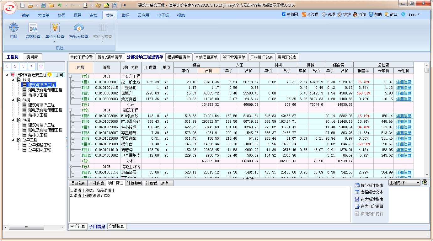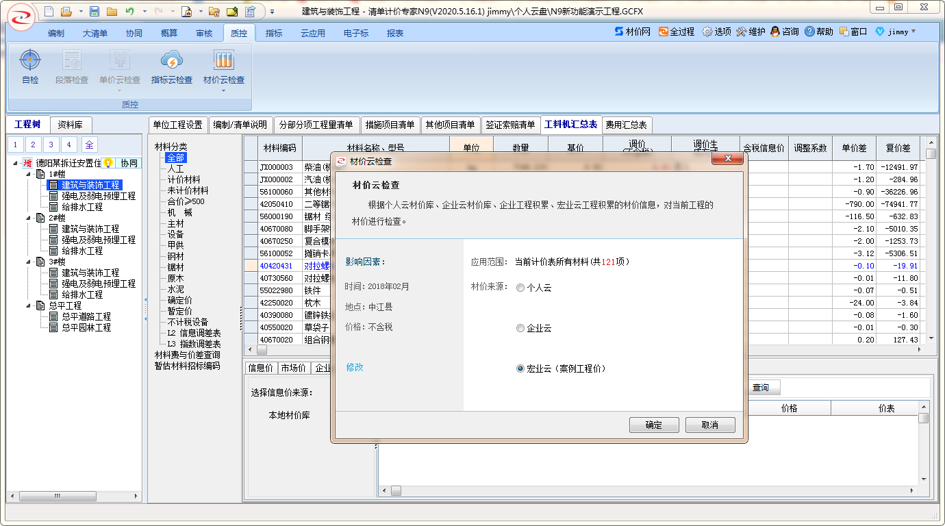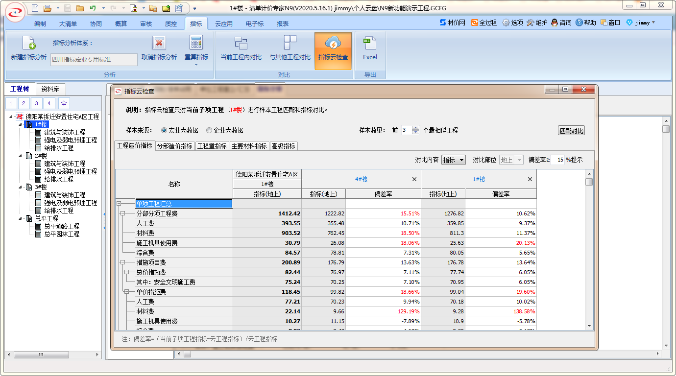 质量控制,依托宏业、企业、 个人造价大数据库,对编制的综合单价、材料单价、指标分析结果进行比较检查,快速发现偏差,无缝在云计价中调整,全面提高编制质量。