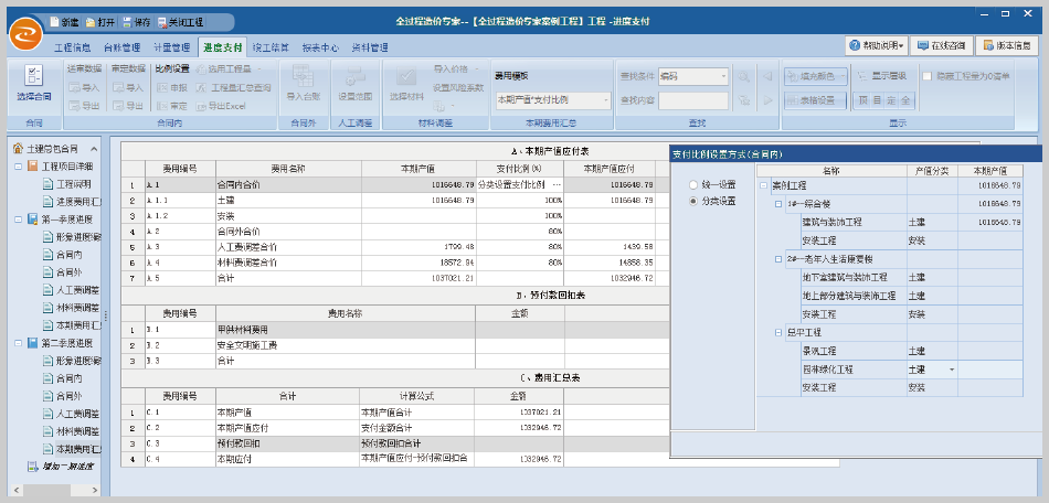 支持合同、申报、审定、剩余、累计数据在同一张表上体现,方便快捷完成进度报送;支持工程量明细数据汇总查看,实时掌握整个项目清单完成和剩余情况;支持材料费快速调差;支持人工费快速调差;支持不同专业进度款设置不同支付比例;兼容不同计价软件和Excel格式的编审数据,快速完成进度支付。
